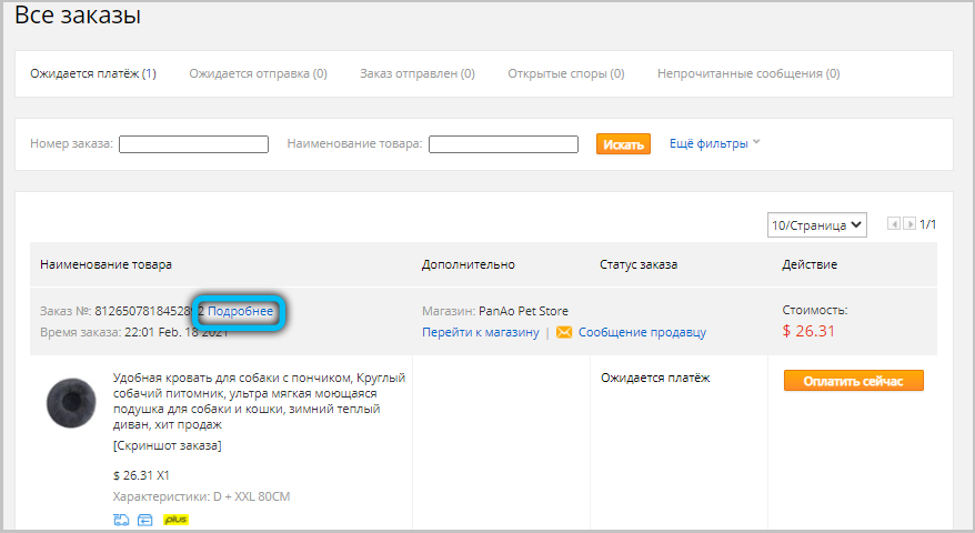 - кликнуть рядом с заказом раздел «Подробнее» – в графе высветятся детали покупки;