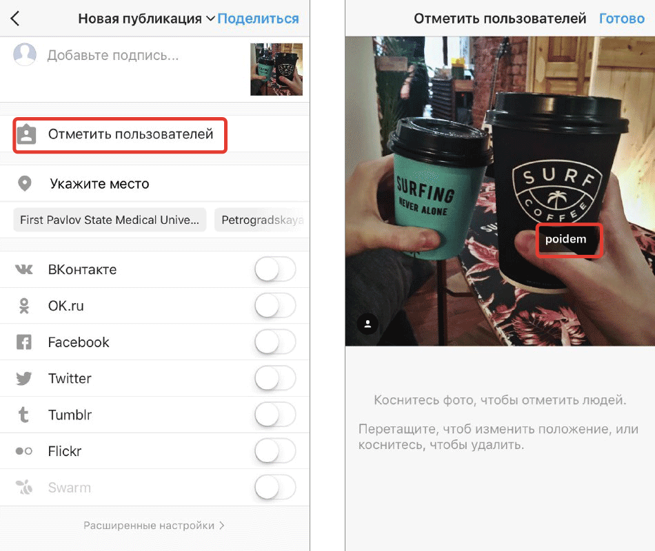 Давайте сначала рассмотрим первый вариант, когда отметка пользователя осуществляется на этапе публикации фото.