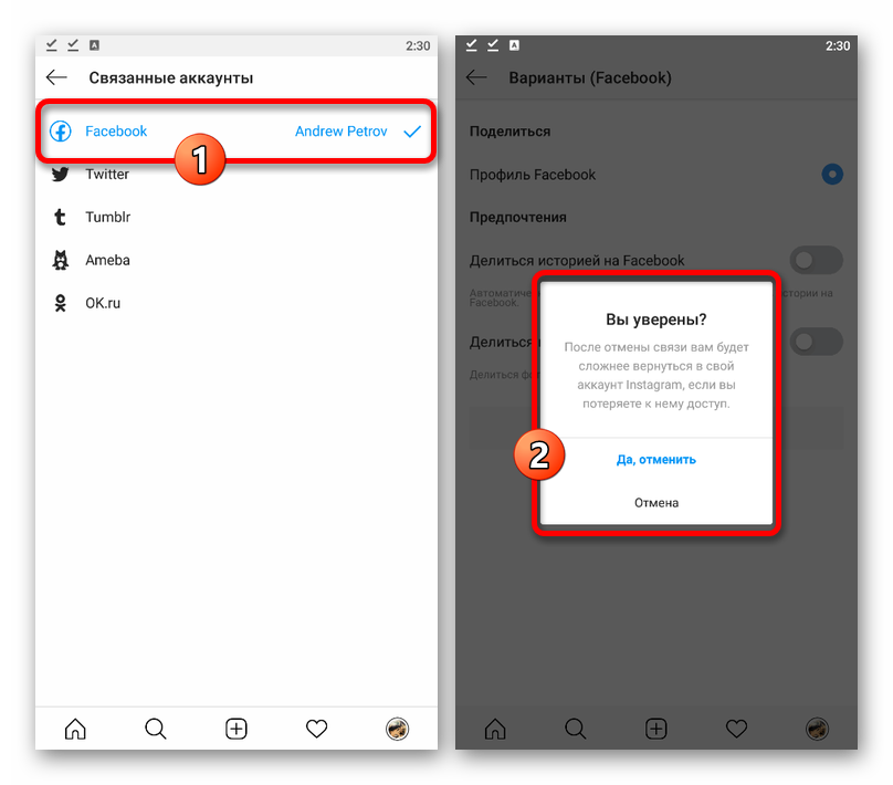 Делается в два шага из-за того, что в Instagram отключаем возможность автоматической публикации, а в Facebook — чтобы возможно было удалить все связанные публикации и в общем удалить все данные связанные с другой сетью.
