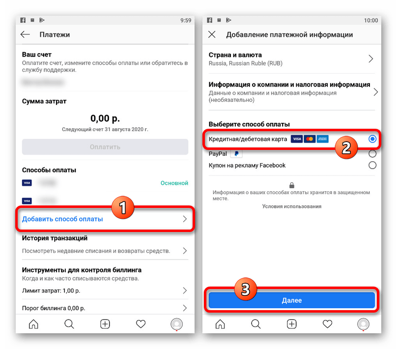 - По необходимости также можете указать новые реквизиты и впоследствии выбрать в качестве основных, как было показано ранее. Для этих целей, опять же, откройте раздел «Платежи за промоакции» в параметрах учетной записи и на сей раз воспользуйтесь опцией «Добавить способ оплаты» в одноименном блоке.