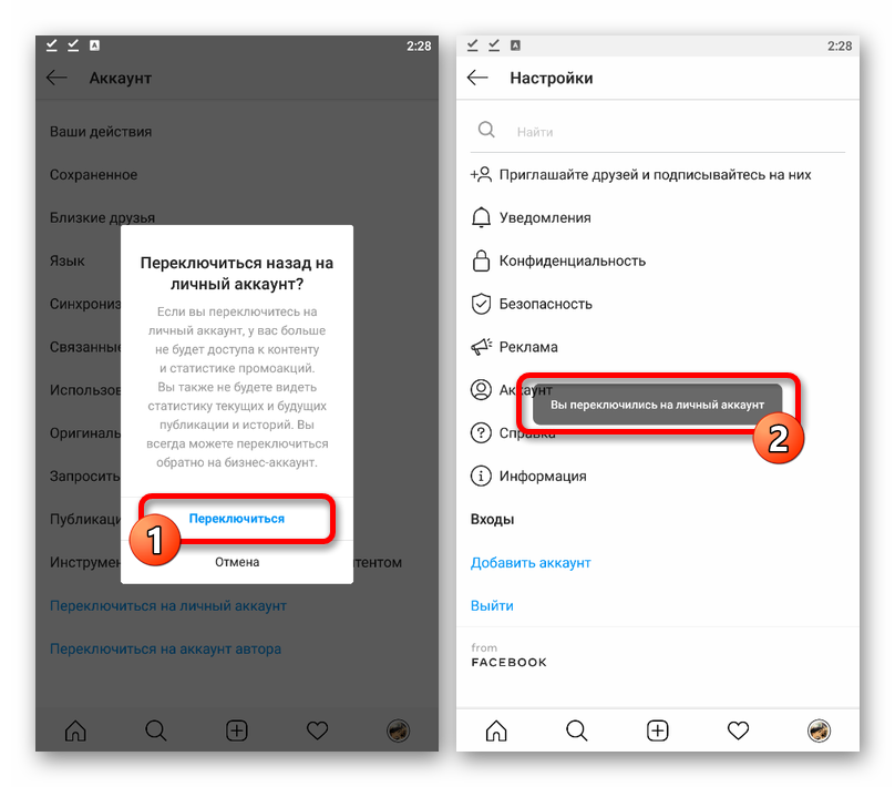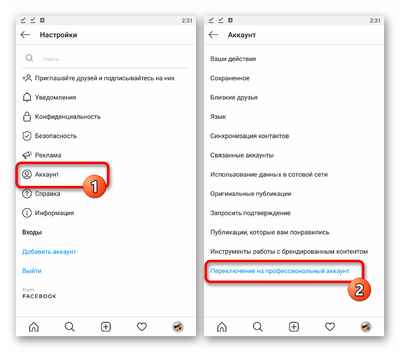 Выполнив отвязку, теперь можете заново превратить личный профиль в бизнес-страницу. Для этих целей откройте «Настройки», перейдите в раздел «Аккаунт» и воспользуйтесь ссылкой «Переключение на профессиональный аккаунт».