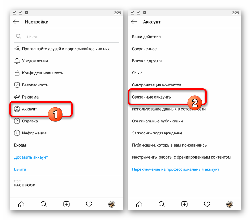 Перейдите в “Аккаунт”, чтобы отвязать страницу Инстаграм от Фейсбука,