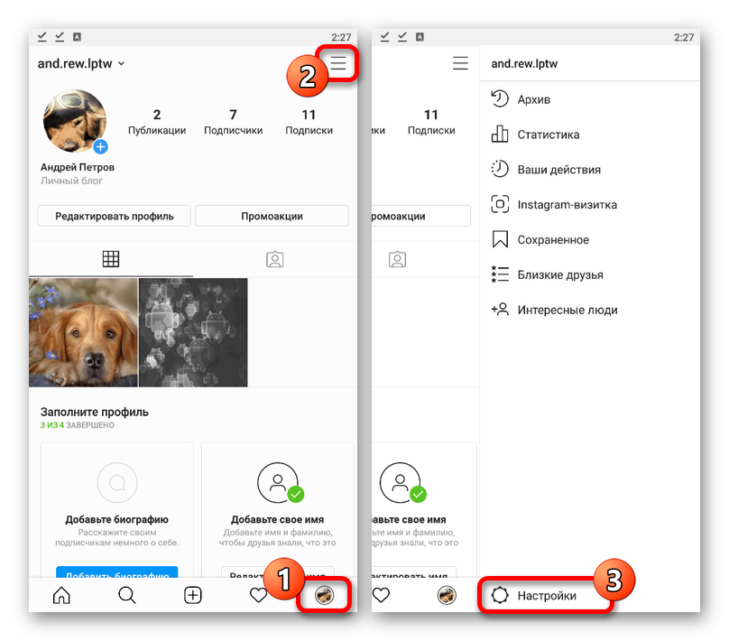 - Для отвязки банковской карты через Инстаграм, откройте данное приложение, перейдите к просмотру профиля с помощью нижней панели и коснитесь значка в правом верхнем углу экрана. Через представленное меню нужно развернуть «Настройки».