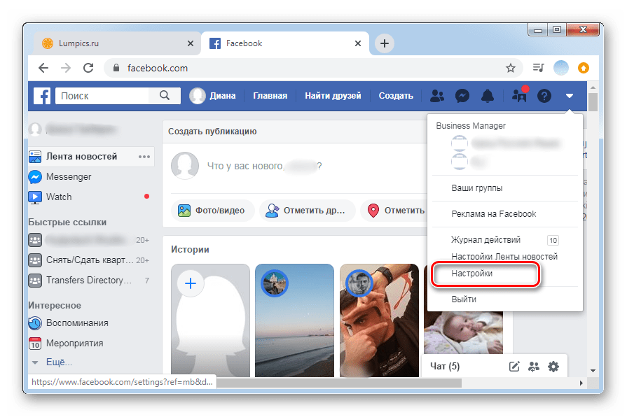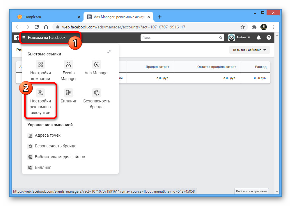 - Перейдите в Ads Manager и выберите пункт «Настройки».