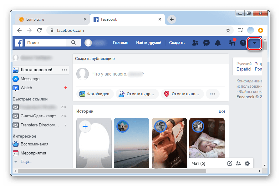 - Откройте главную страницу Facebook. В правом верхнем углу кликните по небольшой стрелочке.