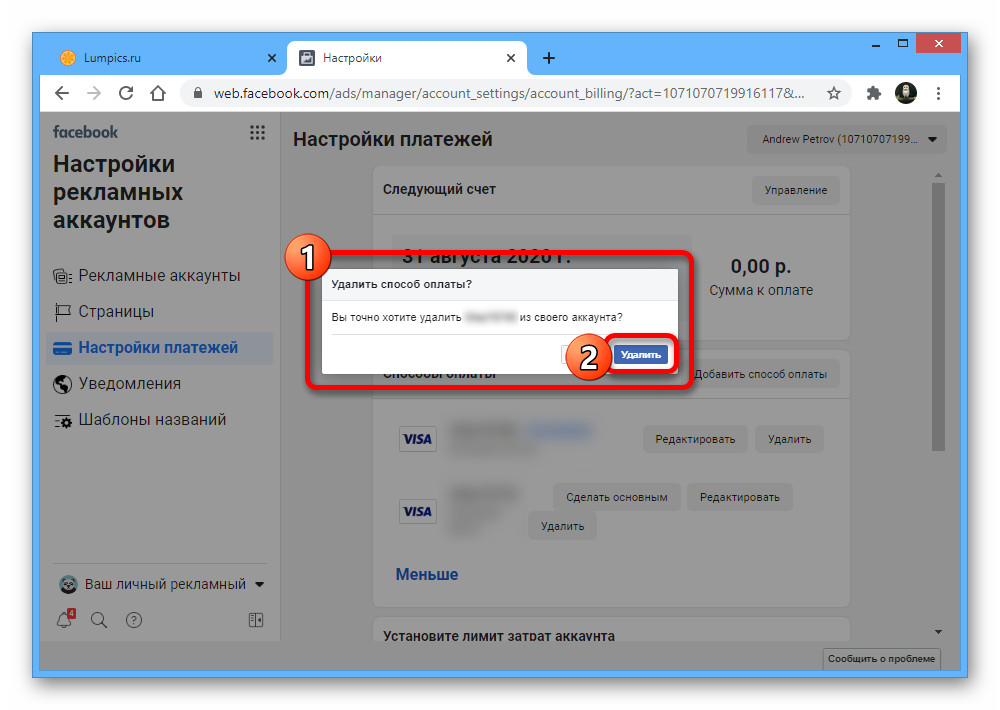 Единственной полноценной альтернативой первому способу является удаление банковской карты непосредственно через сам Фейсбук, тем самым автоматически отключив реквизиты от всех привязанных социальных сетей, включая Инстаграм. Данная процедура уже была нами достаточно подробно рассмотрена на примере личного профиля в инструкции по представленной ниже ссылке.