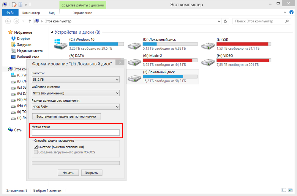 - Третий способ. Переименование флешки происходит при форматировании. Для этого открываем “Свойство” в папке мой компьютер. Далее делаем клик по пункте “Форматирование”. Перед вами откроется окно, в котором переименуйте флешку. Ищите строку “Метка тома”. Далее прописывайте новое название флешки в поле.