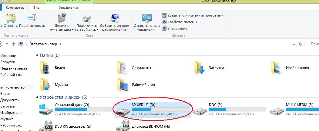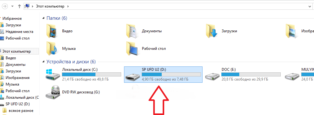 - Перед вами откроется окно с дисками компьютера и вашей флешкой.