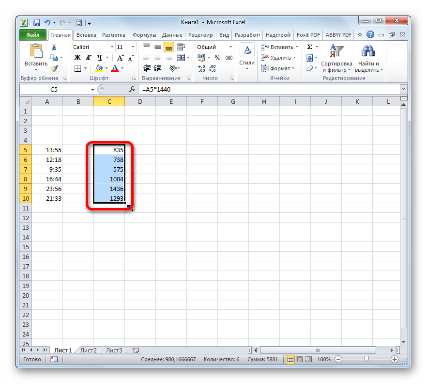 - Как видим, после данного действия значения всего ряда будут преобразованы в минуты.