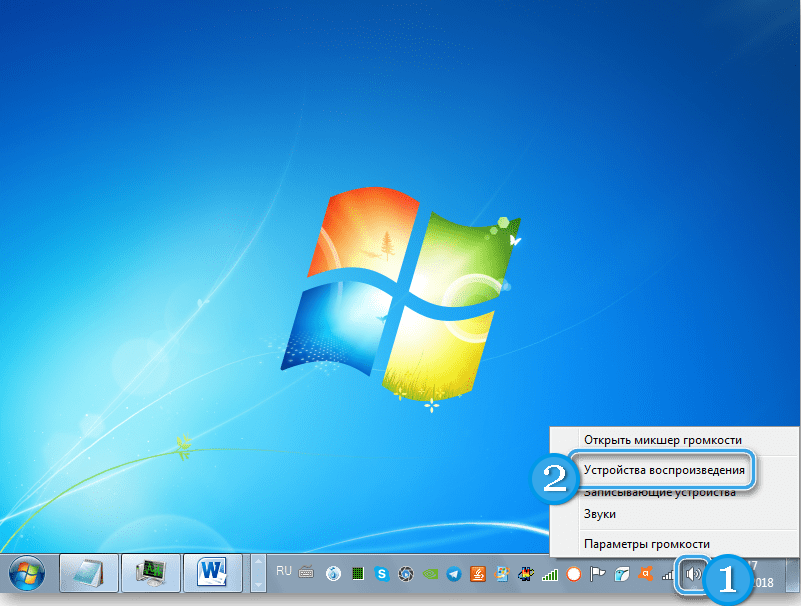 1. Открываем «Устройства воспроизведения» через контекстное меню пиктограммы «Динамики» или апплет «Звуки».