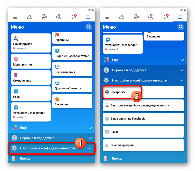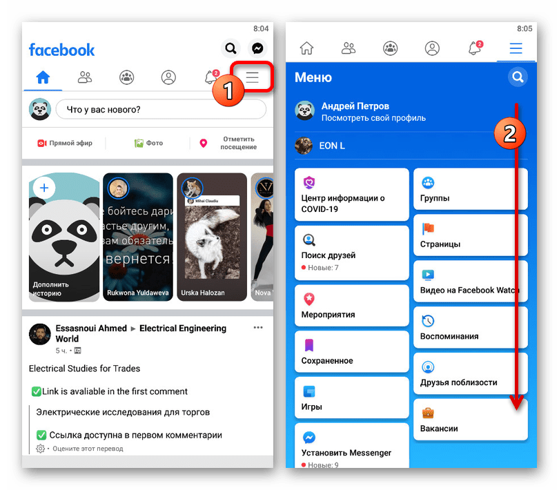 - Запустите мобильное приложение Фейсбук и коснитесь расположенной справа кнопки на панели в верхней или нижней части экрана. Данное меню необходимо пролистать вниз.