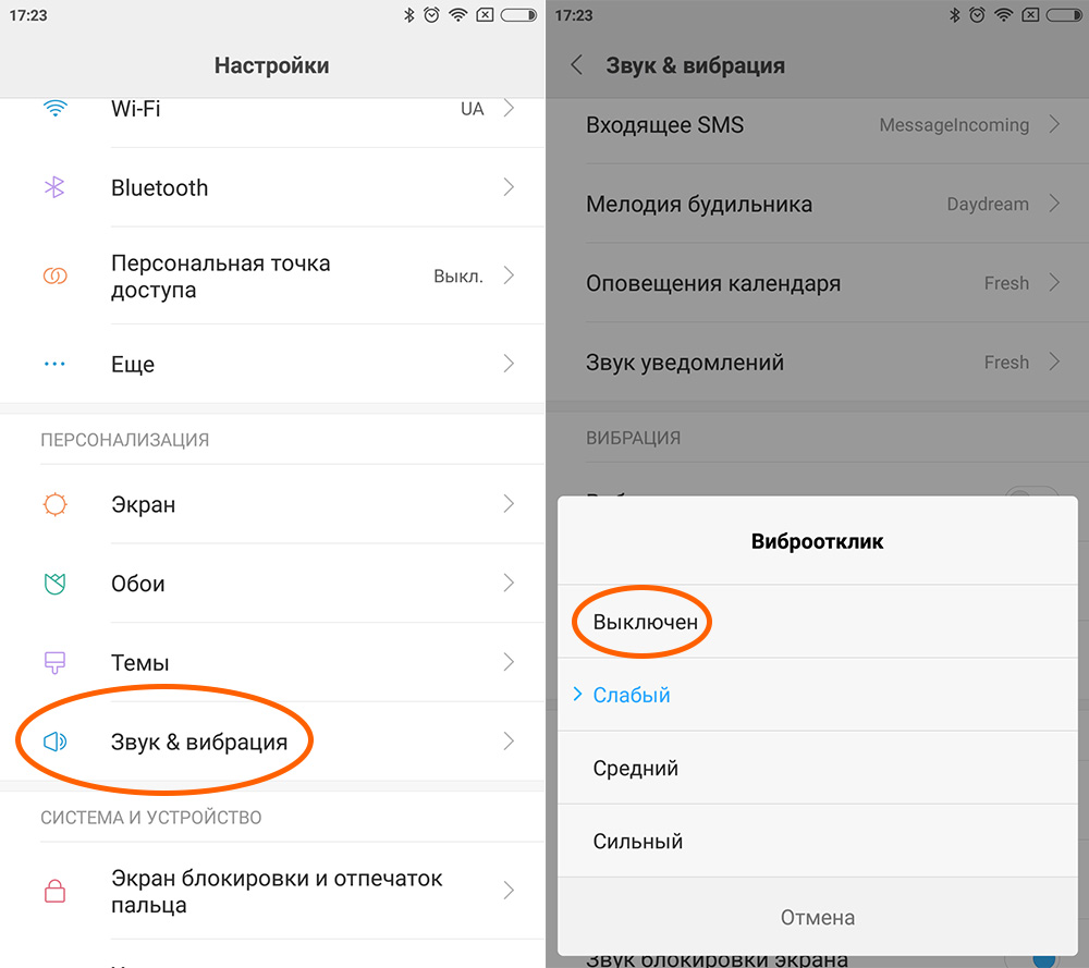 Отключить отклик в виде вибрации сенсорных клавиш просто. Стоит зайти в настройки смартфона и в подразделе «Персонализация» выбрать пункт «Звук & вибрация». В новом окне находите команду «Виброотклик» и из предложенных вариантов утвердить состояние «Выключен».