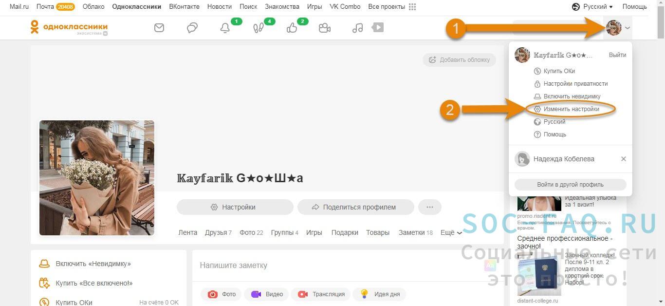 В случае когда имеется доступ к собственной странице в «Одноклассниках», то можно сменить имеющийся пароль на другой, более надежный очень быстро. Для этого понадобится кликнуть на небольшой треугольник в правом верхнем углу возле аватарки. Затем появится выпадающее меню, где следует нажать на строку «Изменить настройки».