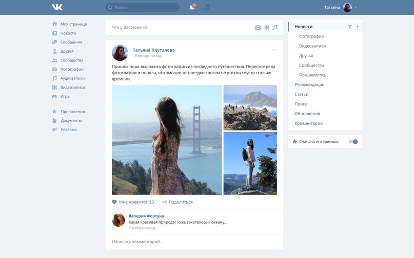 Переработано отображение каждого элемента. Записи в ленте стали заметнее. Списки новостей теперь в отдельном блоке справа вместе с поиском и комментариями. Включить умную ленту новостей стало проще — переключение в режим «Сначала интересные» находится сразу под этим блоком.