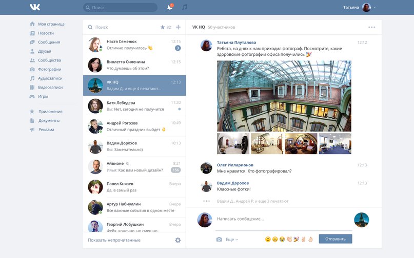 », то его дизайнеры создали полностью с нуля. Теперь диалоги и текущий чат находятся на одном экране, что намного упростило процесс переключения между беседами. Синей точкой помечаются непрочитанные сообщения, а зеленая сигнализирует о том, что в данный момент пользователь находится в сети.