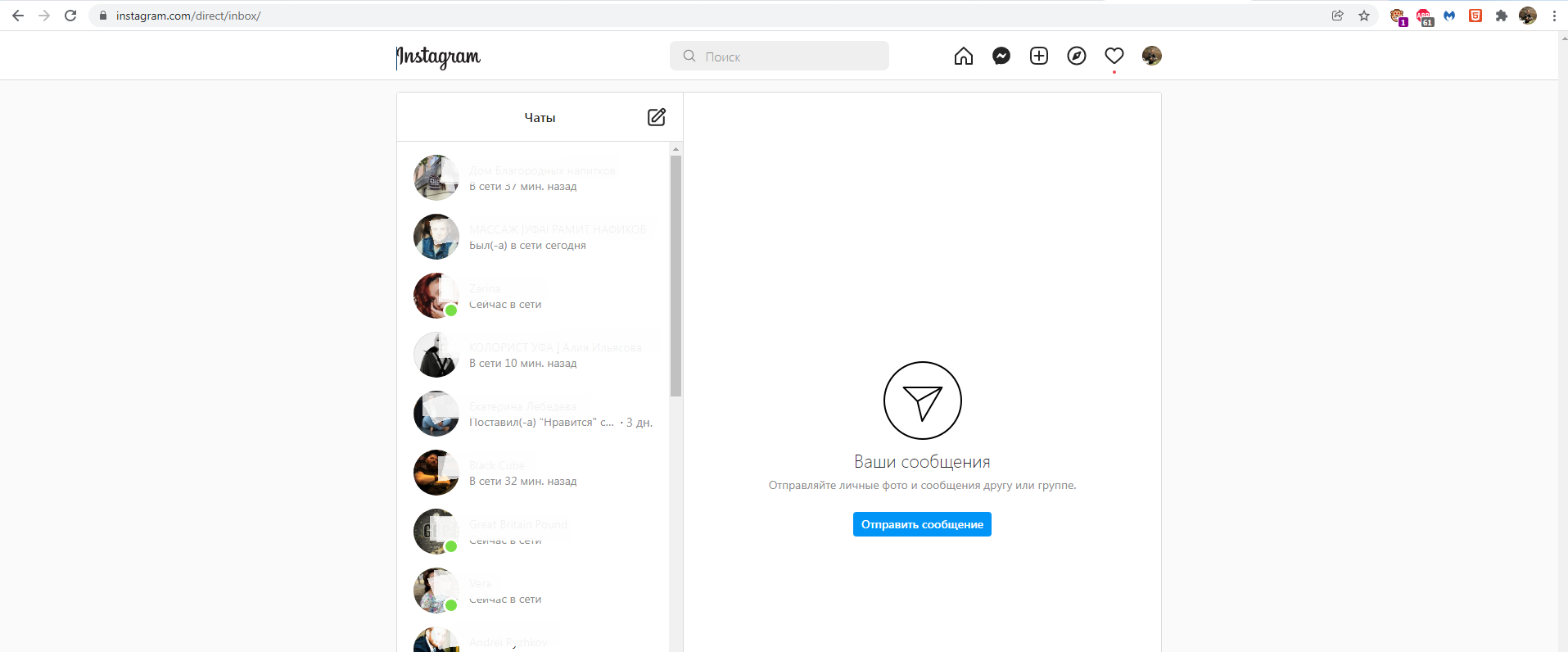 Кроме iOS и Android личное общение в Instagram доступно и тем, кто заглядывает в социальную сеть через браузер. Знакомая иконка «Поделиться» (или «Самолетик») доступна на панели быстрого доступа, закрепленной в правой верхней части интерфейса, по соседству с новостной лентой и «плюсиком» для подготовки новых публикаций.