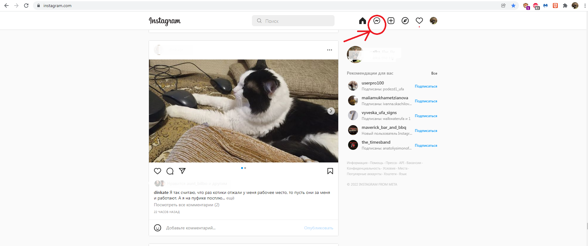 - Заходим в директ в правом верхнем углу ленты новостей.