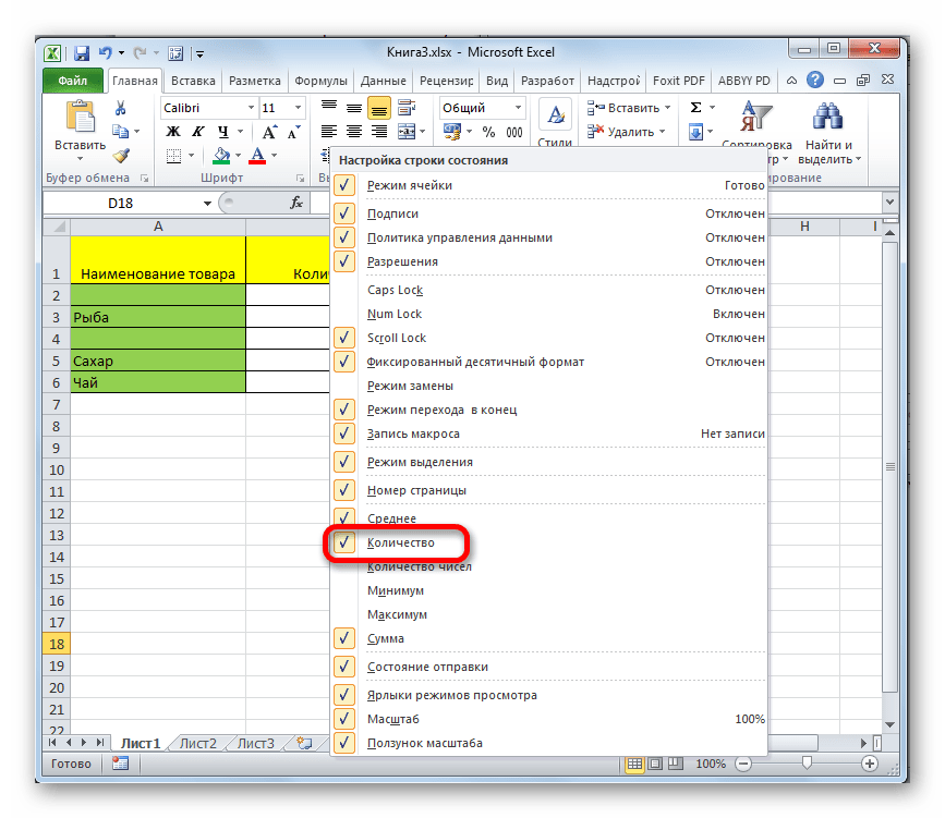 Но бывают и ситуации, когда вы выделяете заполненные ячейки в строках, а отображение количества на панели состояния так и не появляется. Это означает, что данная функция просто отключена. Для её включения кликаем правой кнопкой мыши по панели состояния и в появившемся меню устанавливаем галочку напротив значения «Количество». Теперь численность выделенных строк будет отображаться.