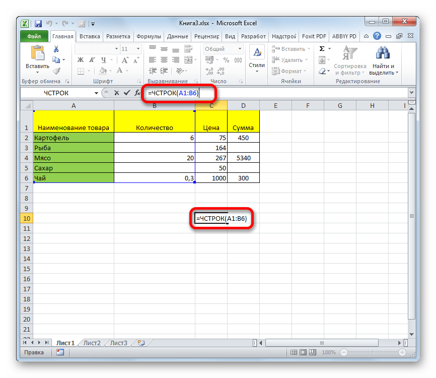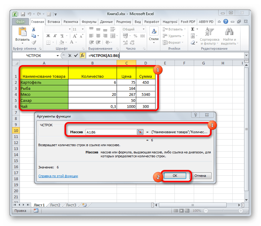 Но, вышеуказанный способ не позволяет зафиксировать результаты подсчета в конкретной области на листе. К тому же, он предоставляет возможность посчитать только те строки, в которых присутствуют значения, а в некоторых случаях нужно произвести подсчет всех элементов в совокупности, включая и пустые. В этом случае на помощь придет функция ЧСТРОК. Её синтаксис выглядит следующим образом: