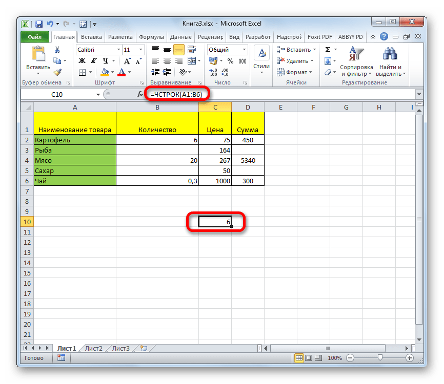Нажмите клавишу Enter, и она вернет количество строк с данными.