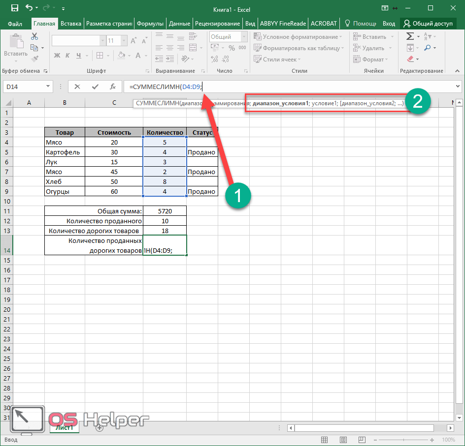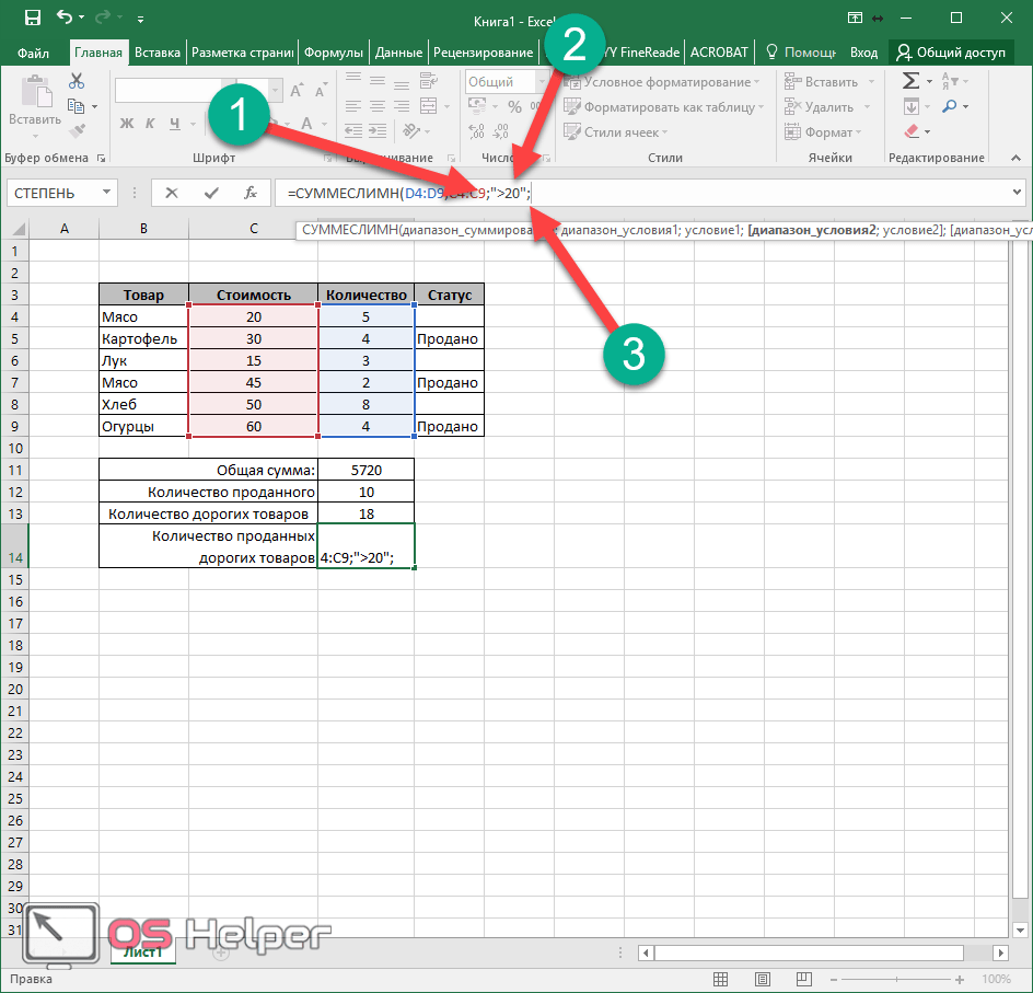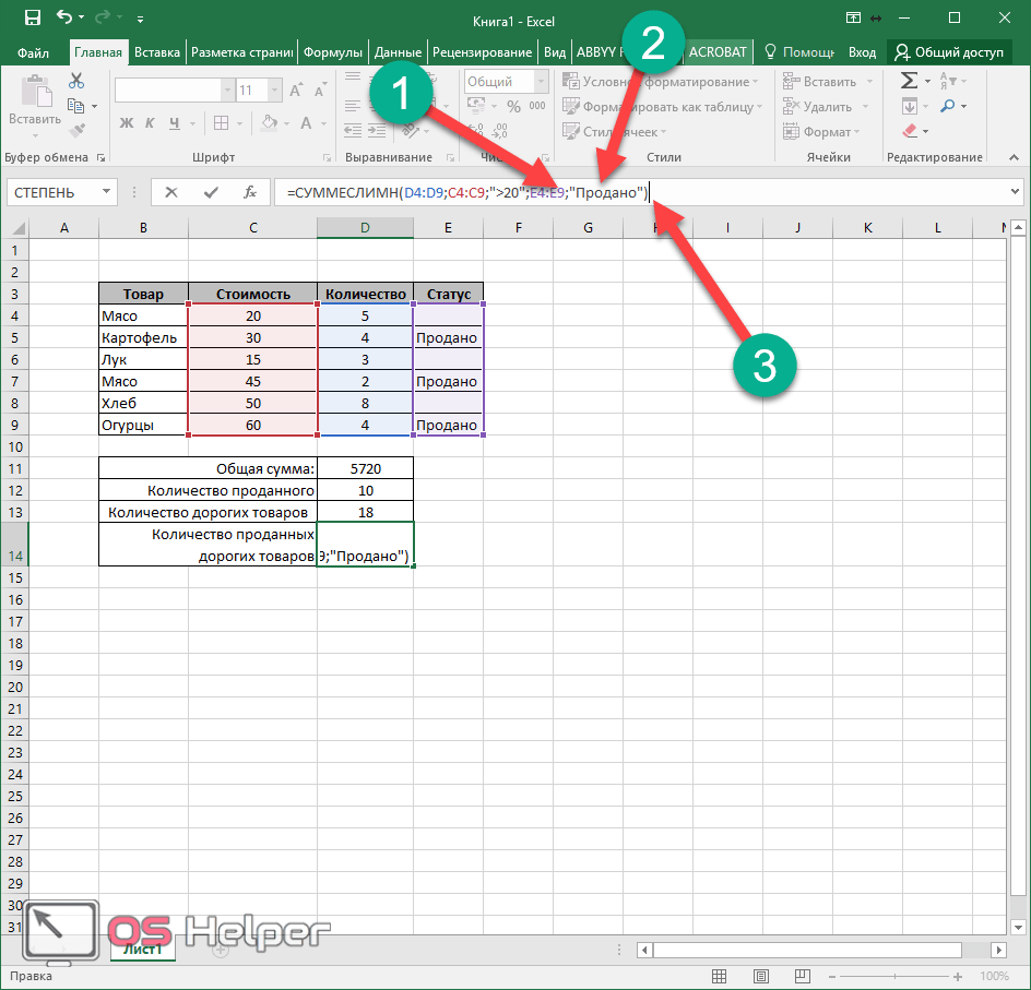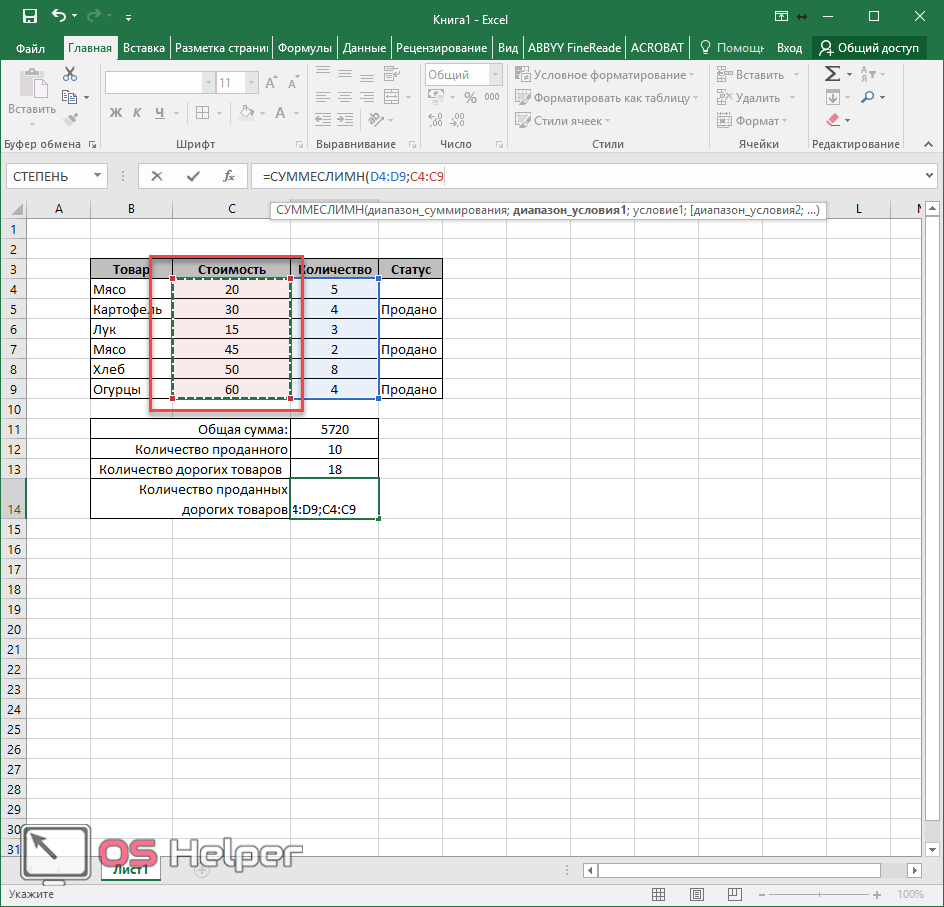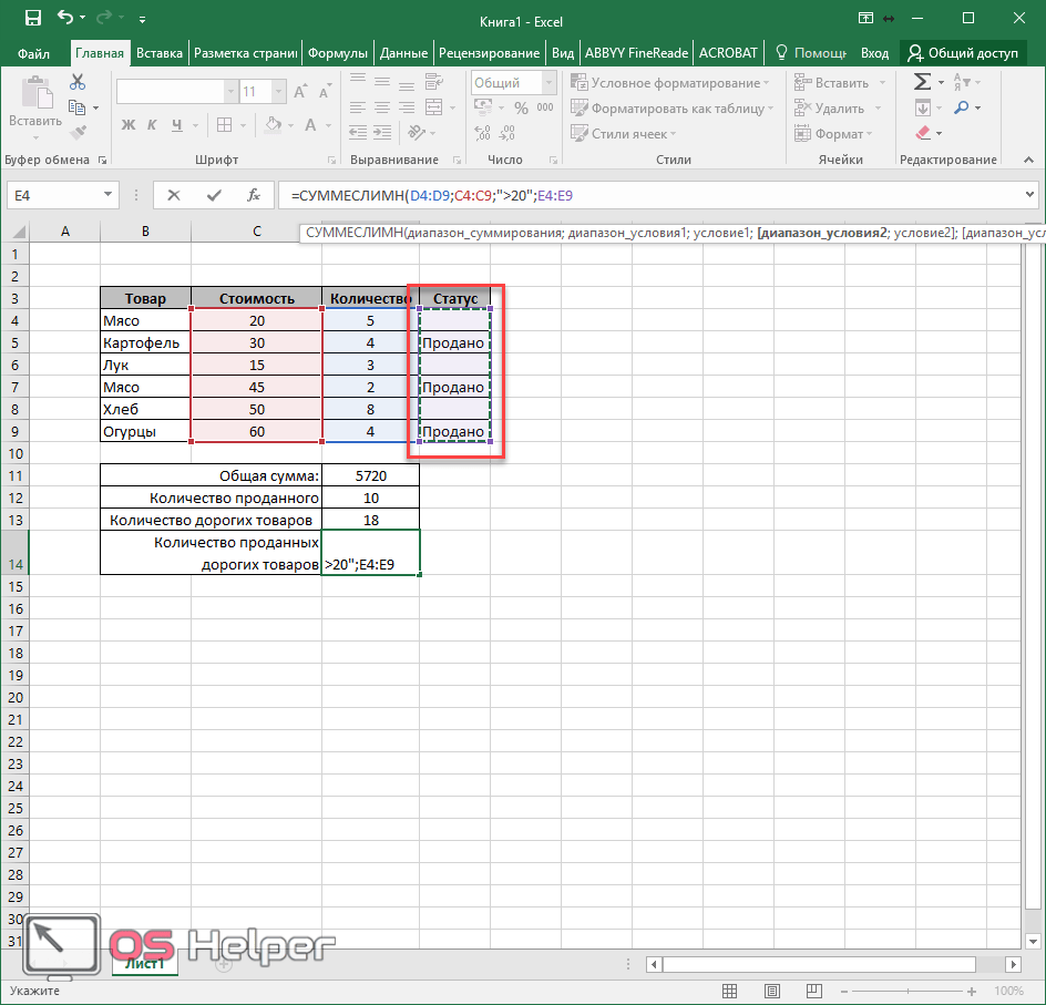 Но иногда всё намного сложней. Например, могут быть случаи, когда нужно посчитать в столбце сумму всех одновременно и дорогих, и проданных продуктов. Рассмотрим, как правильно составить формулу для этой ситуации.