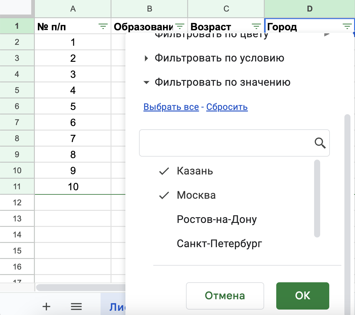 Щелкните по выпадающему списку столбца «Город» и отметьте галочками только Москву и Казань. Нажмите «ОК».