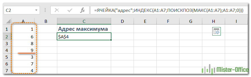 Получаем результат в виде абсолютной ссылки $А$4, которая указывает на самое большое число из этого диапазона.