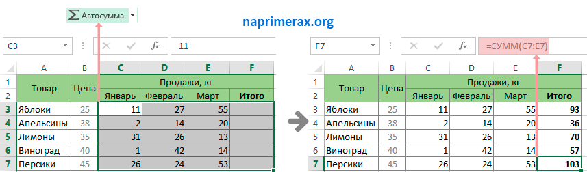 В следующем примере мы просуммируем общую стоимость всех проданных фруктов. Для этого воспользуемся следующей формулой: