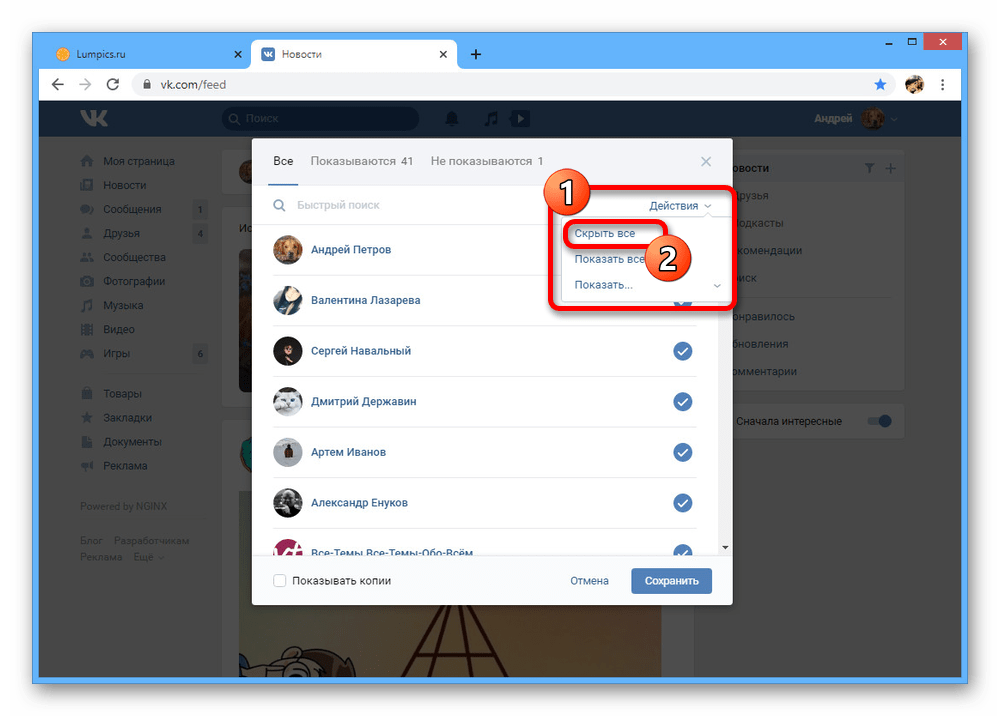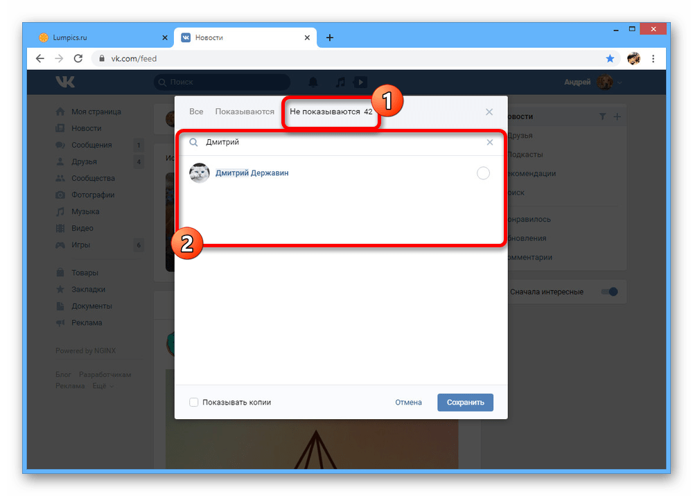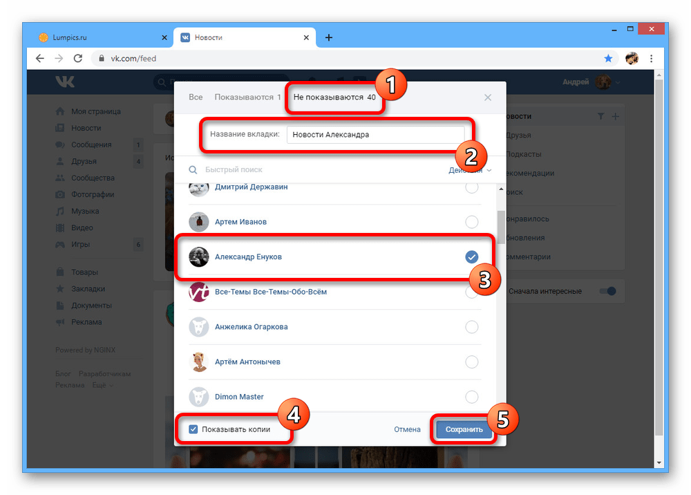 На веб-сайте ВКонтакте управление новостями производится на одноименной вкладке, позволяя скрыть или отобразить события определенных людей и целых сообществ. При этом если выбрать одного конкретного пользователя, в ленте будет представлена информация не только об изменениях на странице, но и уведомления о любой активности вроде комментариев.