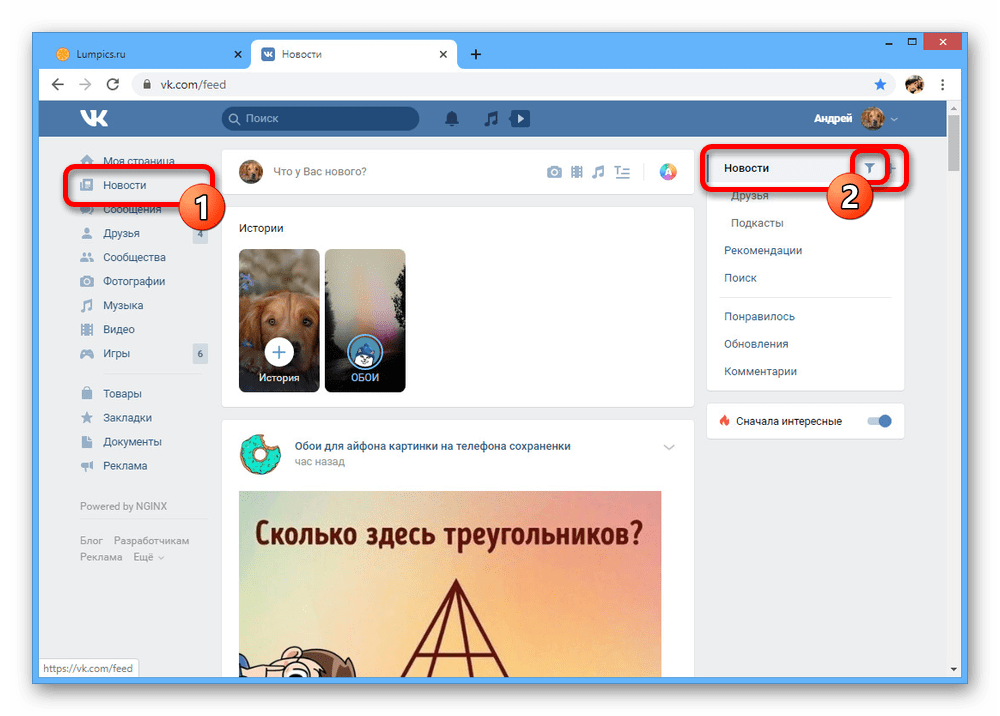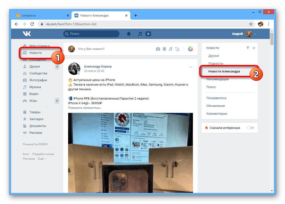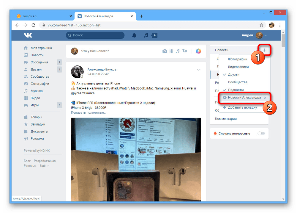 На сайте ВКонтакте, помимо настроек общего фильтра, также присутствует возможность создания пользовательского списка для более быстрого переключения между несколькими лентами. Такой способ куда удобнее в использовании, так как не затрагивает основные новости, а выступает полноценной альтернативой с индивидуальными параметрами.