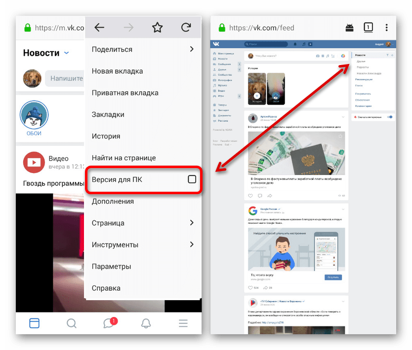 Также в браузере телефона можно перейти на версию для ПК. Для этого: