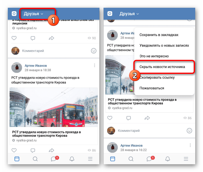 В отличие от полной версии социальной сети, на мобильном телефоне ни через официальный клиент, ни с помощью альтернативных приложений нельзя отредактировать новости на свое усмотрение. Соответственно, по этой причине отсутствует возможность просмотра обновлений конкретного друга отдельно от прочих пользователей. При этом все же можно воспользоваться общим разделом с информацией об активности.
