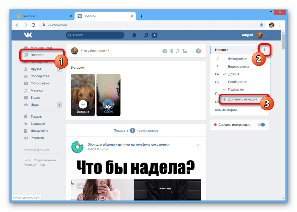 Да, теперь можно и так. Только единственный минус, сначала нужно подписаться на человека или вступить в нужную группу. Затем заходим в «Новости» и нажимаем плюсик. В списке выбираем самый нижний пункт «Добавить вкладку».