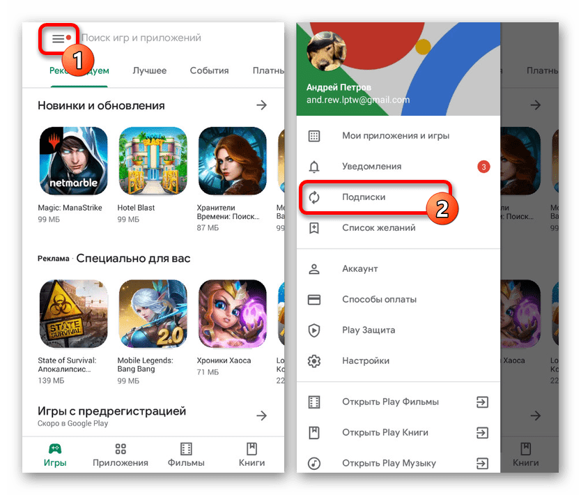 - Откройте приложение Google Play Маркет и нажмите по значку с тремя полосами в левом верхнем углу экрана. Через представленное меню нужно перейти на страницу «Подписки».