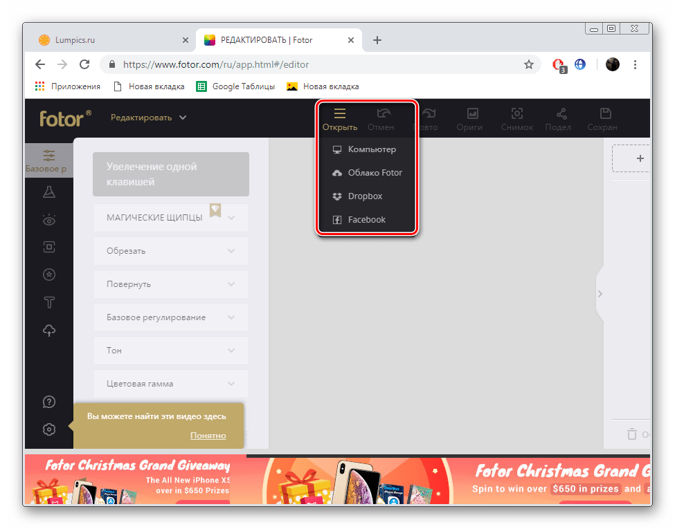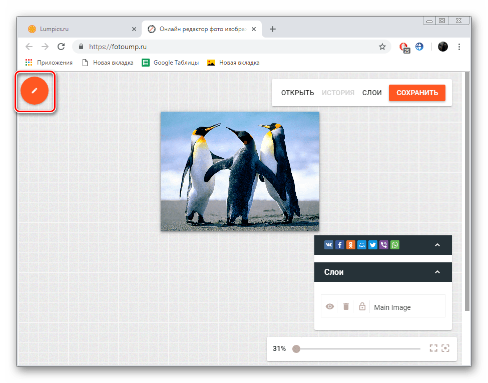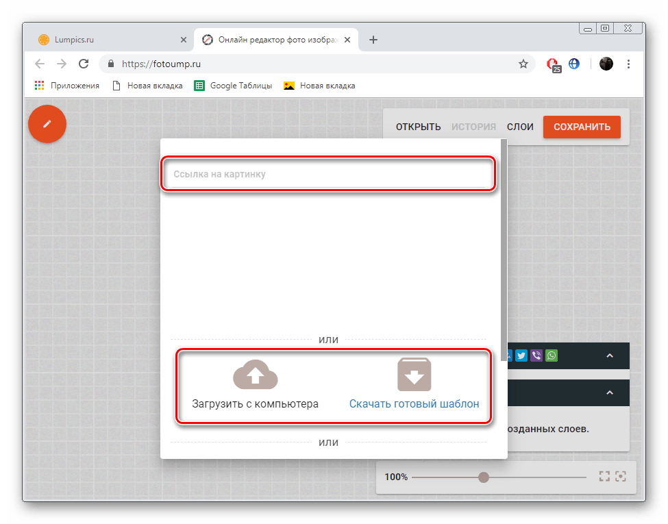 - Воспользуйтесь указанной выше ссылкой, чтобы перейти на главную страницу Fotoump. После того как вы попали в редактор, приступайте к загрузке снимка любым удобным методом.
