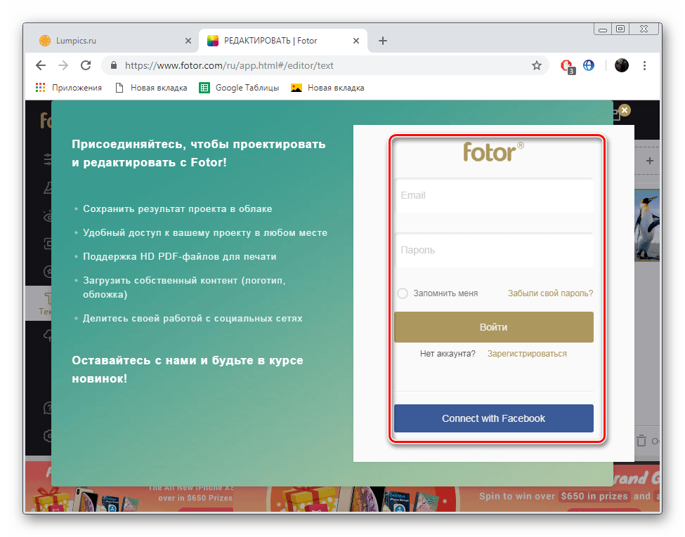 Необходимо будет пройти бесплатную регистрацию или авторизоваться через свой аккаунт в социальной сети Facebook.