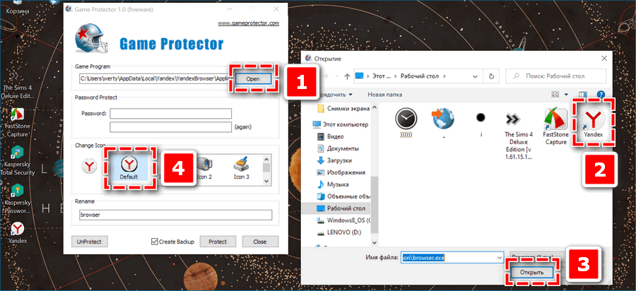- Чтобы убрать пароль с браузера запустите утилиту Game Protector и откройте расположение браузера.