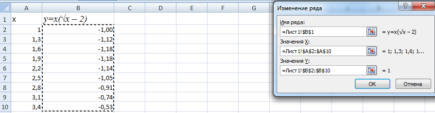 Выделяем значения Х (1-ый столбец). И жмем «Добавить». Раскрывается окно «Изменение ряда». Задаем имя ряда – функция. Значения Х – 1-ый столбец таблицы с данными. Значения У – 2-ой.