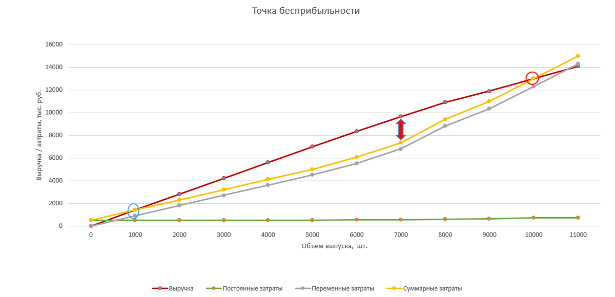 Тот уровень безубыточности, которого кондитерская достигла на начальном этапе, соответствует выпуску в 1 000 шт. Прибыль на диаграмме — это расстояние между графиками суммарных затрат и выручки. После выхода на окупаемость она растет и достигает максимума при выпуске в 7 000 шт. Далее величина прибыли снижается, и при выпуске около 10 000 шт. компания работает «в ноль». При дальнейшем же увеличении объемов бизнес опять становится убыточным.