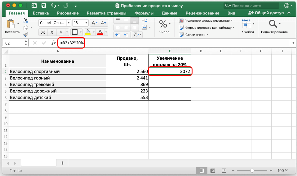 Допустим, нам нужно получить число после прибавления к нему процента. Для этого необходимо ввести такую формулу в ячейку или строку формулы. Предоставляем шаблон, нужно подставить подходящее для конкретного случая значение.