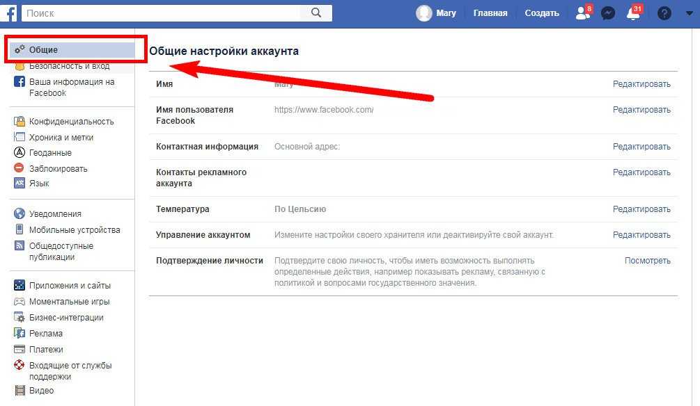 - Чтобы поменять параметры существующей привязки, если она была выполнена только что или уже давно, когда во ВКонтакте еще присутствовала данная возможность, можно воспользоваться Фейсбуком. Для этого разверните меню в правом верхнем углу окна и выберите «Настройки и конфиденциальность».