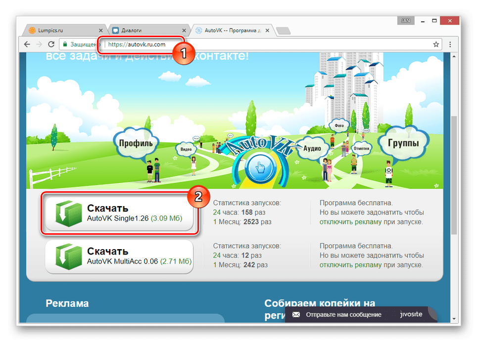 Для этого воспользуемся бесплатной программой AutoVK. Скачать ее можно с официального сайта – адрес указан на скриншоте ниже в правом нижнем углу.