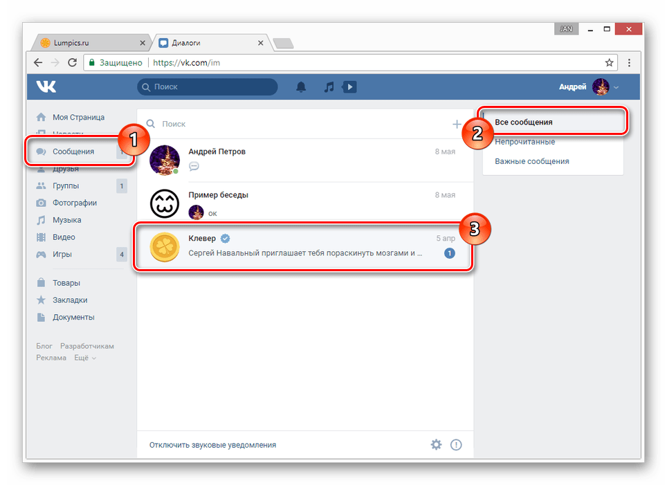 Бывает и так, что человек мог забыть прочесть некоторые переписки, но в это время активно общался с другими людьми, и тогда диалоги с непрочитанным содержимым могли опуститься в списке. Тогда можно быстро узнать количество непрочитанных диалогов в соответствующем пункте меню в разделе “Сообщения”. Для этого нужно перейти на страницу со списком диалогов и в выбрать пункт “Непрочитанные”. Тогда в списке откроются только непрочитанные диалоги.
