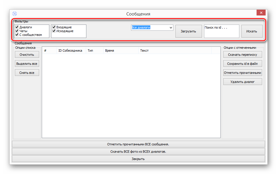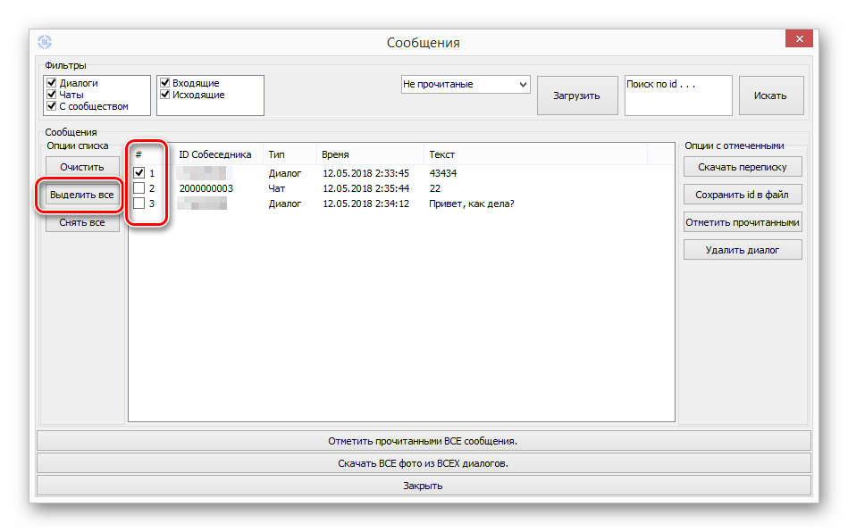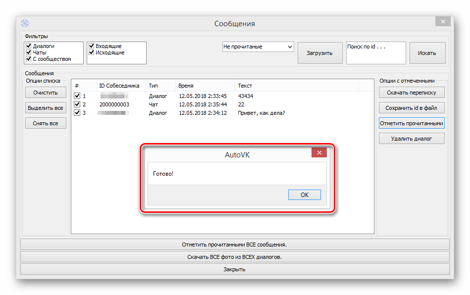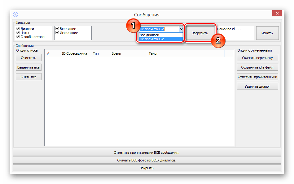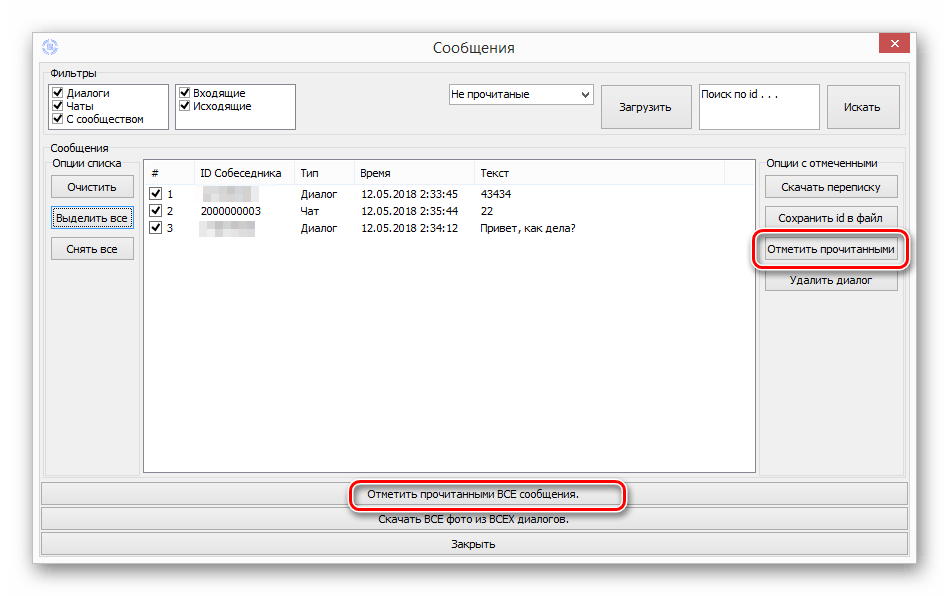 Далее на следующей открывшейся странице нужно сначала в соответствующем списке выбрать «Не прочитанные» сообщения и нажать на кнопку «Загрузить». После этого в левой части программы нужно кликнуть на «Выделить все», чтобы отметить все появившиеся в этом окне диалоги с непрочитанными сообщениями. Когда все эти переписки будут отмечены, останется просто в правой части нажать на кнопку «Отметить прочитанными». После выполнения этих действий программа должна показать специальное уведомление о том, что работа была успешно выполнена.
