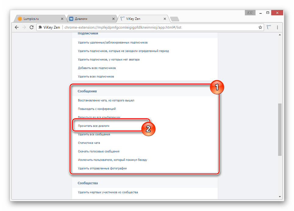 Рассматриваемое в этом методе расширение для интернет-обозревателя, в отличие от большинства других, в первую очередь нацелено на увеличение количества возможностей по множественному выполнению тех или иных операций. То есть, благодаря ему все переписки можно удалить или попросту отметить прочитанными.