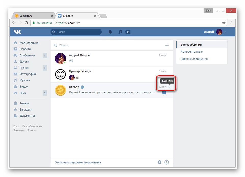 Тем, кому мало просто отметить сообщения прочитанными, а нужно именно удалить непрочитанные диалоги Вконтакте, предлагаю следующий вариант.