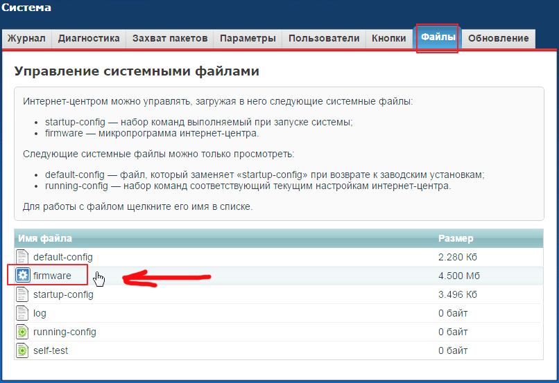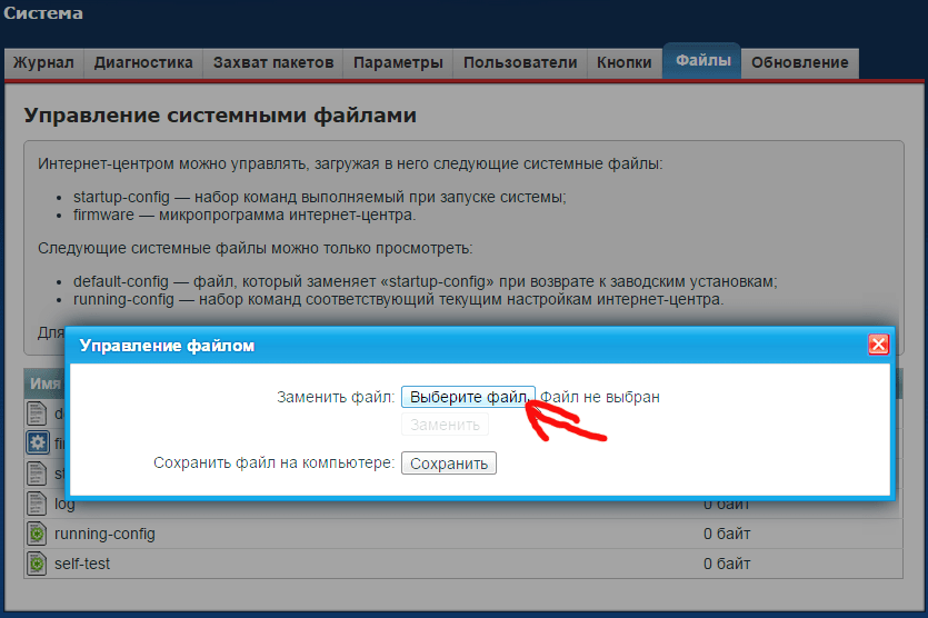 Дальше, заходим в настройки нашего роутера, и переходим на вкладку Система — Файлы (в старой панели управления вкладка Система — Микропрограмма). Нажимаем на файл firmware и на кнопку Выберите файл.