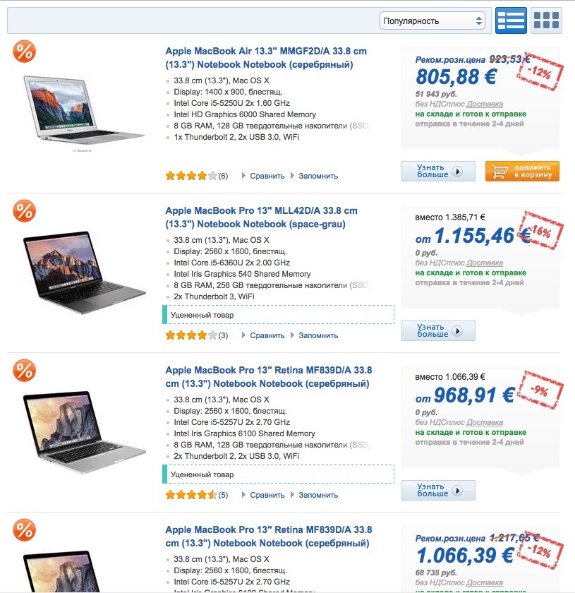 А вот следующий вариант — уцененный MacBook Pro за 969 евро — уже гораздо интереснее. Открываем эту позицию в новой вкладке