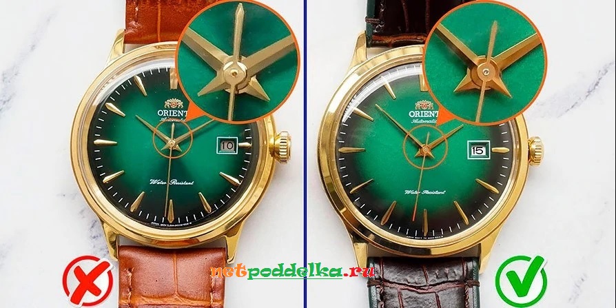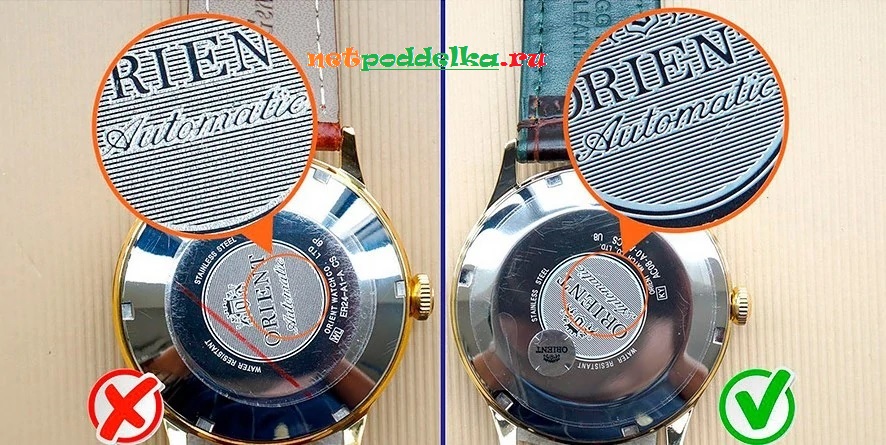 Бюджетные подделки Orient видны невооруженным глазом по нечеткой разметке, расплывчатым надписям. Даже самый маленький дефект в виде царапины, скола, шатающихся элементов или слабого замка является свидетельством фальсификата. Чаще всего такие подделки не механические, а кварцевые. Это является одной из отличительных черт. Сложнее дело обстоит с высокоточными репликами. В этом случае часы Orient-подделка трудно отличимы от оригинала.