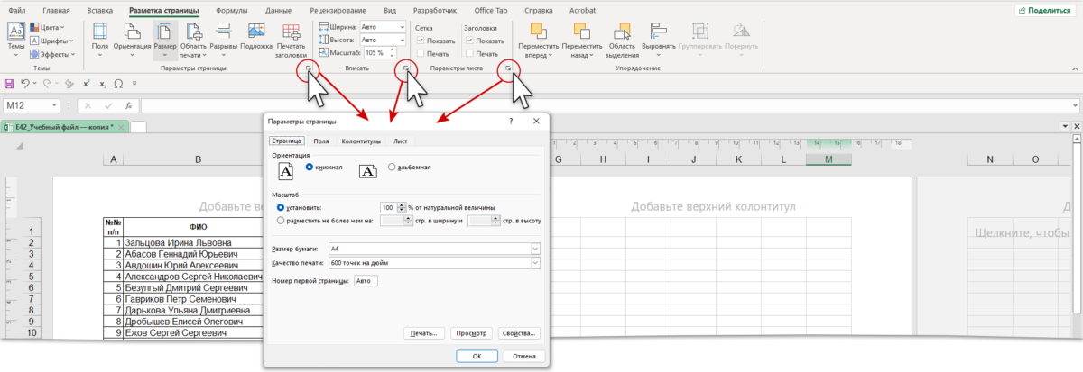 Шаг 1. Для предварительного просмотра рабочего листа сделайте нажимаем команду «Просмотр» в диалоговом окне «Параметры страницы»: